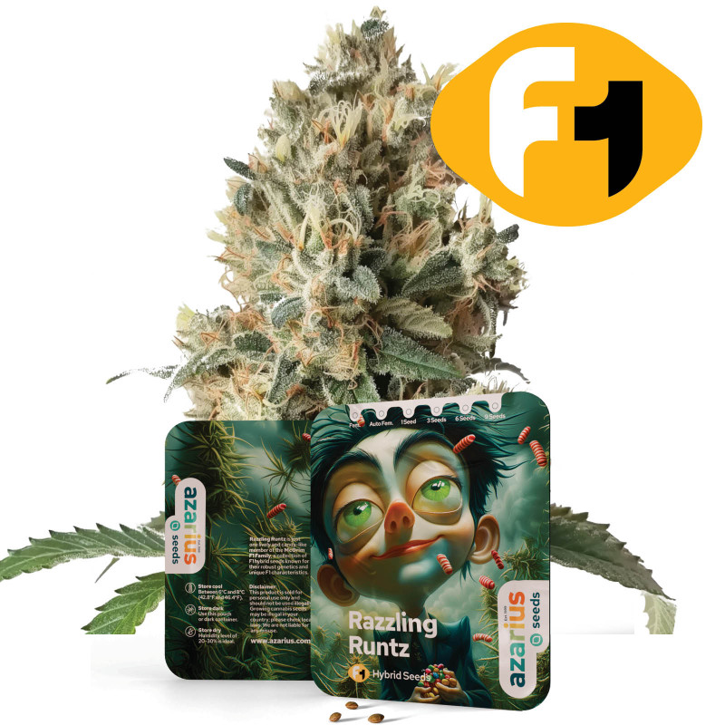Razzling Runtz è un ibrido autofiorente F1 (Runtz x Blueberry) con il 20-25% di THC. Questa varietà offre sapori dolci di frutti di bosco con note tropicali e terrose, fornendo effetti edificanti, euforici ed equilibrati. È facile da coltivare sia all'interno che all'esterno, raggiungendo un'altezza di 65-85 cm, con un ciclo completo dalla germinazione al raccolto in 70-75 giorni.